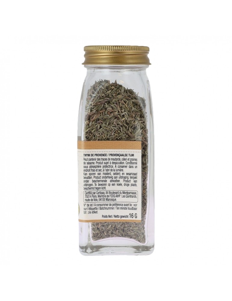 Thym de Provence 100%. Peut contenir des traces de MOUTARDE, CÉLERI et GRAINES DE SÉSAME. Produit sujet à dessiccation.