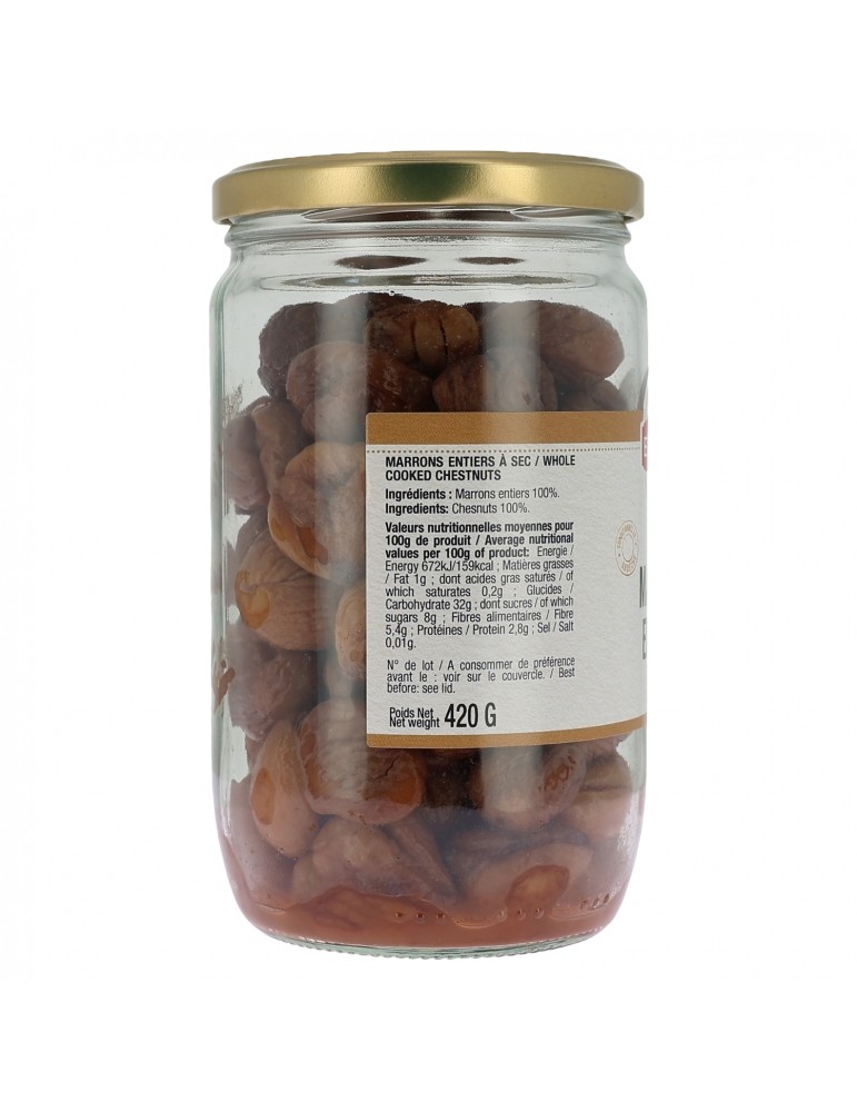 Ces marrons entiers sont transformés au coeur de l'Ardèche. Si vous les utilisez en garniture, rajoutez-les en fin de cuisson pour qu'ils restent bien entiers. Ils sont à utiliser en accompagnement avec de la volaille ou de la viande blanche.