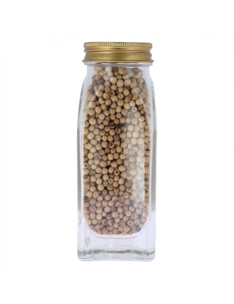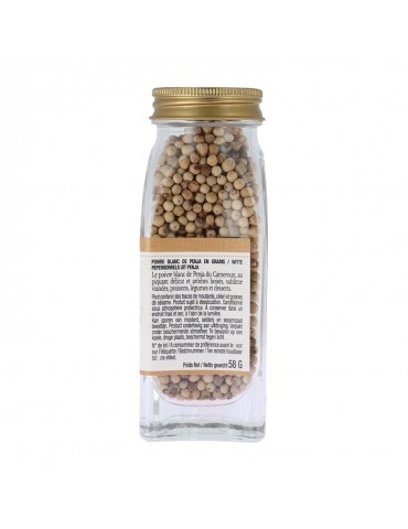 Le poivre blanc en grain de Penja est originaire du Cameroun, cultivé dans un environnement volcanique lui conférant une saveur sans pareil. Très aromatique, d'une grande élégance, très équilibré en bouche, c'est un poivre exceptionnel, un des plus rares au monde. Poivre de caractère avec sa saveur piquante et ses arômes boisés et musqués. Il se mariera parfaitement avec les coquillages, les viandes blanches, les poissons, les sauces blanches, les pâtes, le riz, les légumes à la vapeur, les asperges, les salades et même dans vos desserts à base de fruits : orange ou poire.