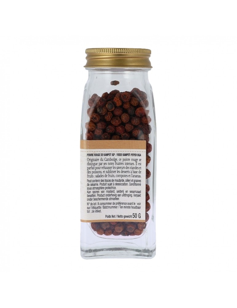 Poivre rouge de Kampot IGP. Peut contenir des traces de MOUTARDE, CÉLERI et GRAINES DE SÉSAME. Produit sujet à dessiccation.