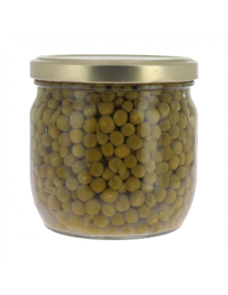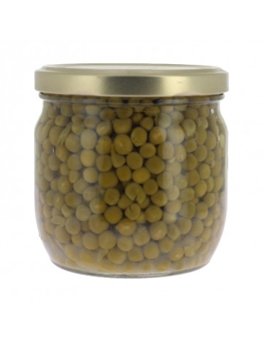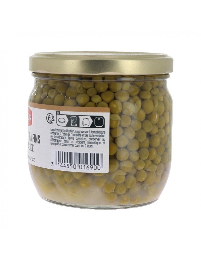 Petits pois extra fins (61%), eau, sucre, oignons grelots (1.2%), sel, salade (0.5%), arôme naturel.