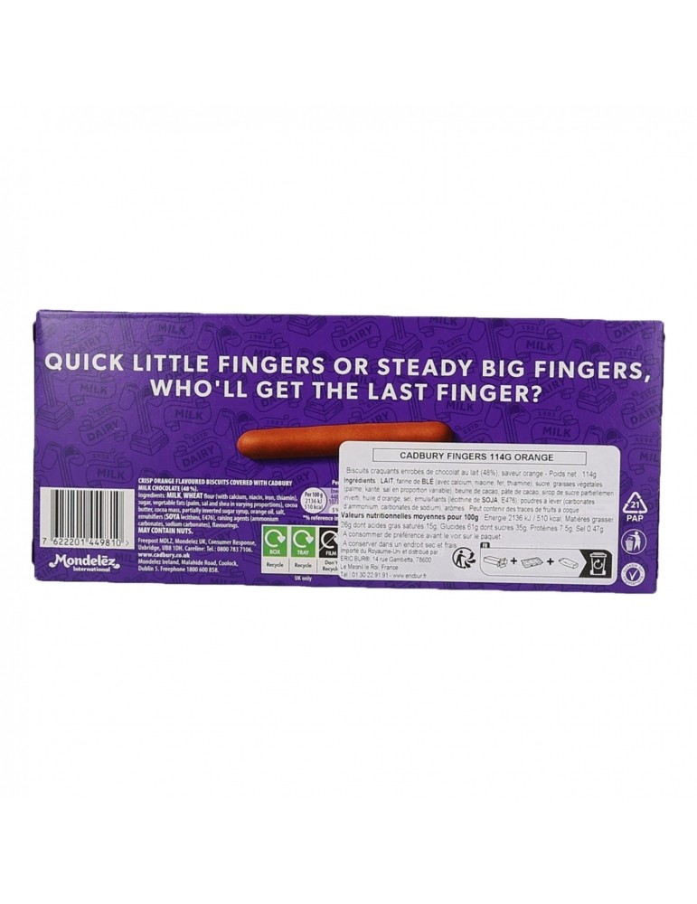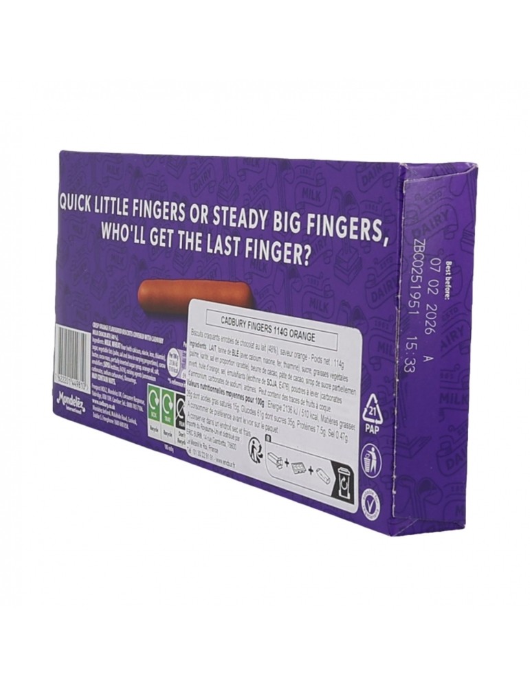 Les biscuits Fingers sont un produit emblématique de la marque Cadbury, appréciés par des millions de consommateurs à travers le monde, pour leur combinaison unique de biscuit croustillant et de chocolat au lait crémeux avec une saveur orange typiquement anglaise. Que ce soit pour une pause café, un goûter ou une soirée entre amis, les Fingers Cadbury sont toujours une option pratique et délicieuse.