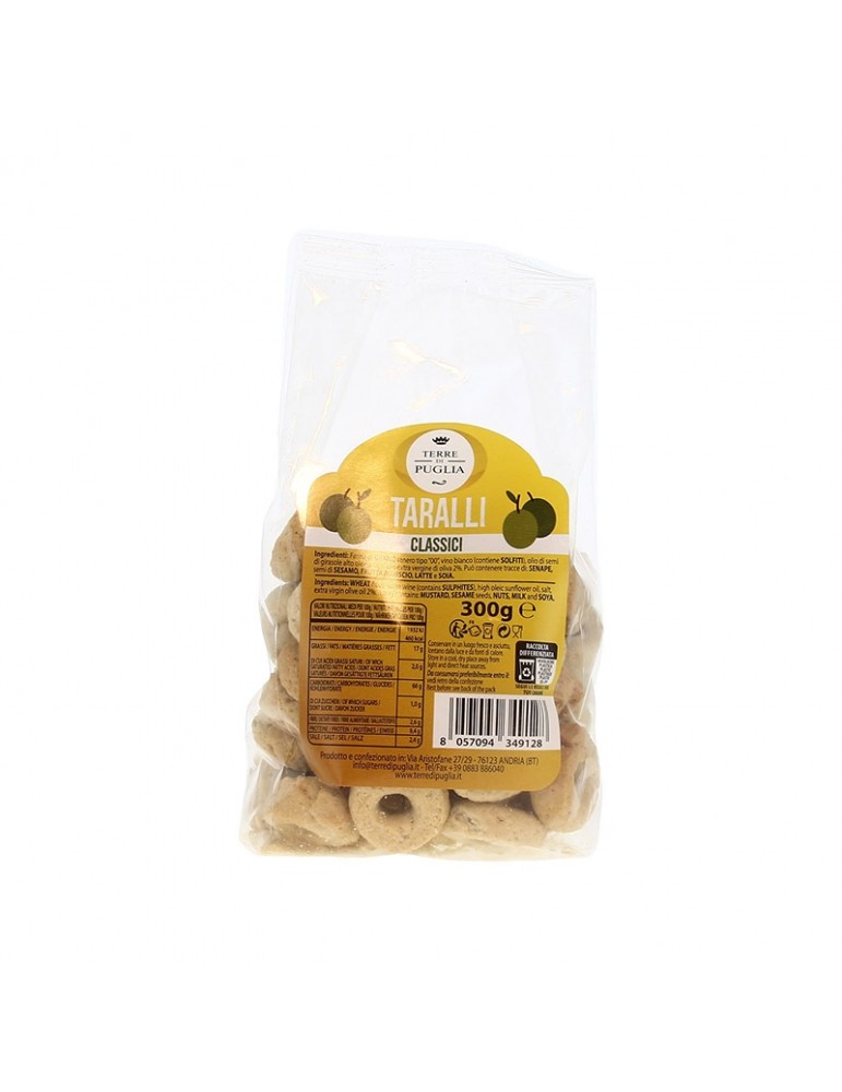 Découvrez la délicieuse gamme de Taralli Terre Di Puglia sur notre site web ! Ces petits biscuits salés, emblématiques de la région des Pouilles en Italie, sont tout simplement irrésistibles. Fabriqués avec une patience et un amour inégalés, ces Taralli prennent vie au cœur de l'Italie, suivant une recette familiale traditionnelle qui se transmet de génération en génération. Le Taralli classique incarne la simplicité des ingrédients, mais explose en saveurs. L'huile d'olive vierge extra, subtilement associée au vin blanc, intensifie l'expérience gustative. Les Taralli Terre Di Puglia sont confectionnés à partir d'ingrédients 100% naturels, puis cuits lentement au four. Le résultat ? Une texture croustillante et friable qui fond délicieusement en bouche, vous transportant instantanément dans l'authentique tradition des Pouilles. Ces petites merveilles sont parfaites pour accompagner tous les moments de votre journée, que ce soit pour une collation rapide, un apéritif convivial entre amis, ou même un dîner gourmand. Les Taralli Terre Di Puglia sont le compagnon idéal. Découvrez également nos saveurs de Taralli, telles que Pizza et Poivre/Fromage, pour une touche supplémentaire de gourmandise. Laissez-vous tenter par cette excursion gustative en Italie et offrez-vous le plaisir authentique des Taralli Terre Di Puglia !